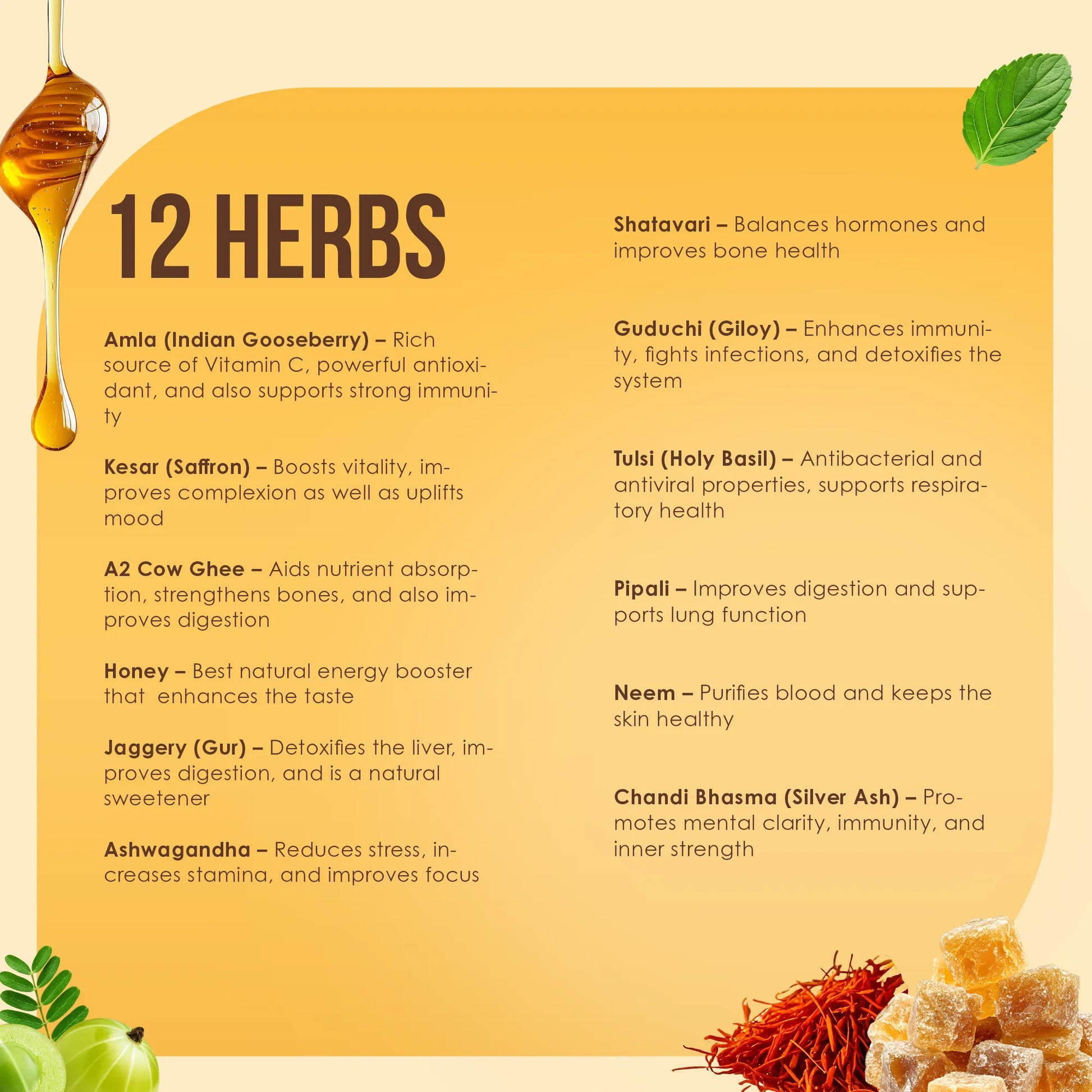 Amla (Indian Gooseberry) – Rich source of Vitamin C, powerful antioxidant, and also supports strong immunity