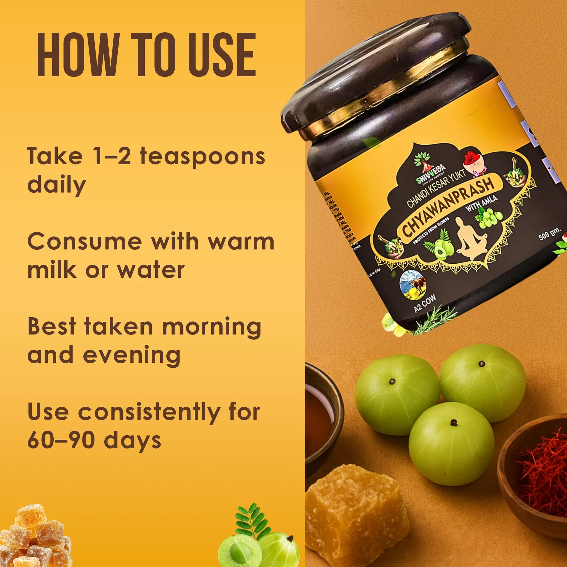 Take 1 to 2 teaspoons of Shivveda Chandi Kesar Yukt Chyawanprash daily