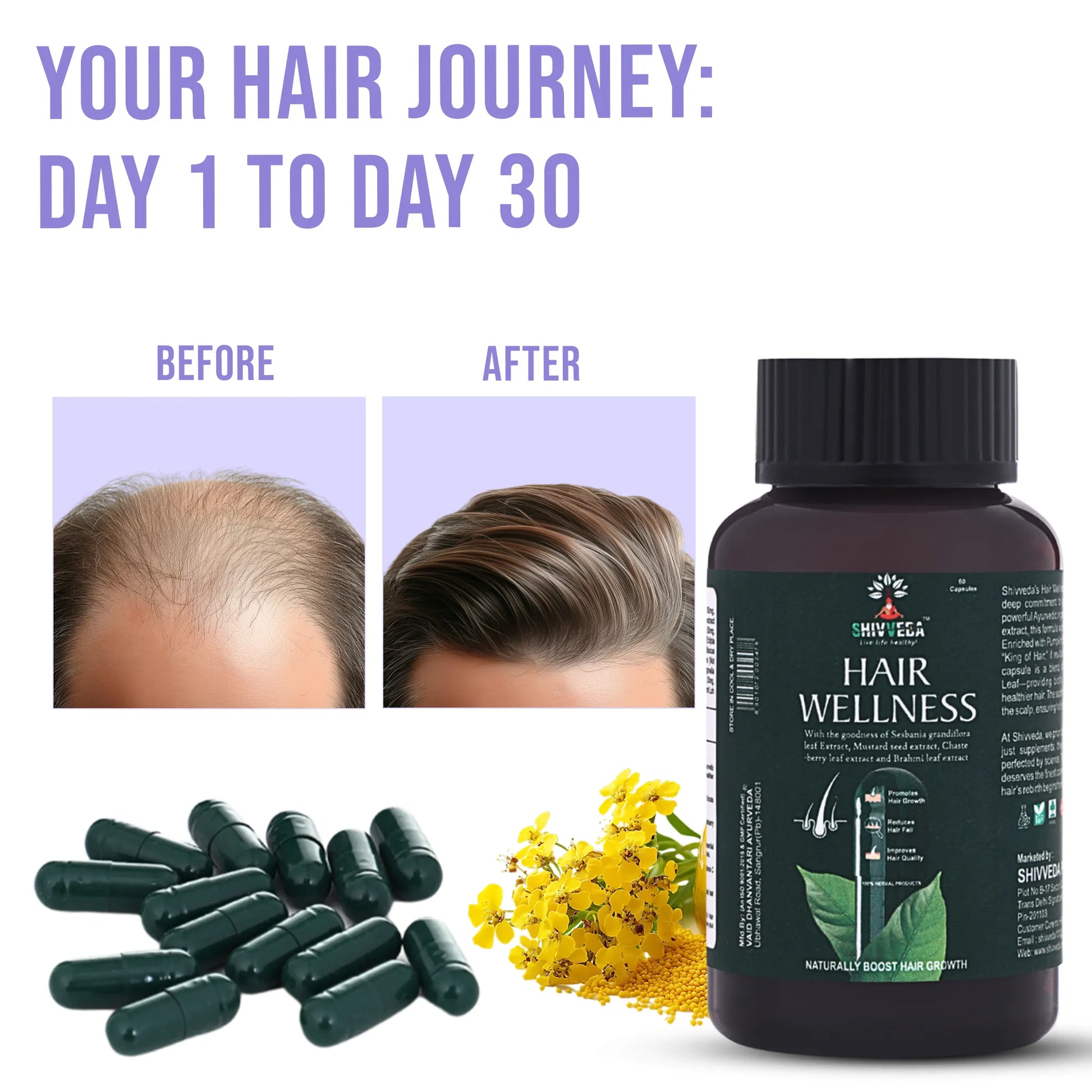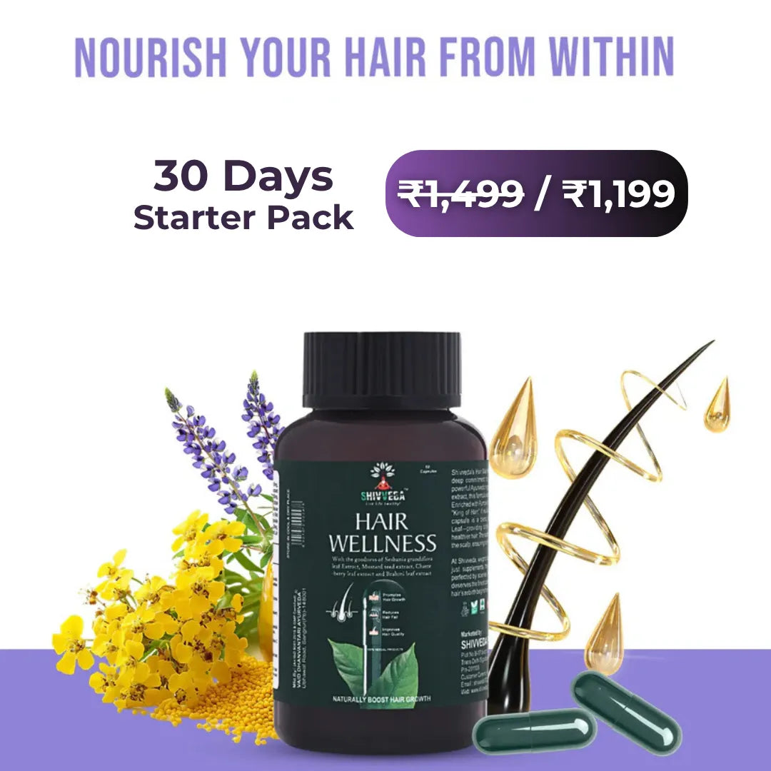 If you're struggling with hair fall, thinning hair, or dullness, Shivveda Hair Wellness is the solution you've been waiting for. This natural hair growth & Care supplement is a mixture of potent blend of Ayurvedic herbs that not only promote stronger, healthier hair, but also nourish the scalp from within.